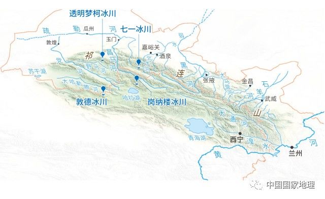 冰川融水和山區(qū)降水形成祁連山水系,水流在山間寬谷盆地匯集成河,流向河西走廊和柴達(dá)木盆地。祁連山北坡流向河西走廊的河流形成了石羊河水系、黑河水系、北大河水系、疏勒河水系和黨河水系,而且一個(gè)水系對(duì)應(yīng)一座城市。