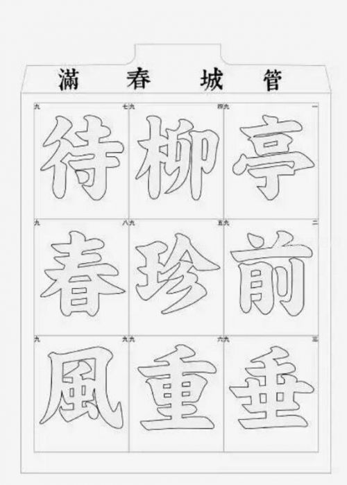 在故宮養(yǎng)心殿后殿,掛有一幅圖,上書“管城春滿”,下面如九宮格一般,從右到左,寫有九個雙鉤空心字:“亭前垂柳珍重待春風”,每個字(繁體字)都是九筆。讀起來詩不詩、詞不詞,如果不懂民俗,可能會一頭霧水。