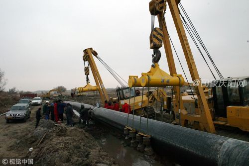 2008年12月18日,中亞天然氣管道控制性工程之一——伊犁河穿越第一條主管完成回拖  @視覺中國