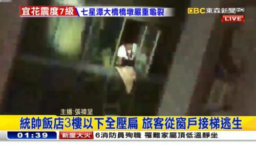 據(jù)臺(tái)灣東森電視臺(tái)直播報(bào)道,花蓮統(tǒng)帥大飯店“3樓以下全壓扁”,旅客從窗戶接梯逃生。統(tǒng)帥飯店106名團(tuán)客居住5樓以上全數(shù)脫困,一樓以下3名值班工作人員受困。