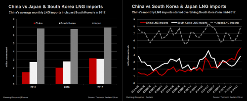 路透社也報道稱,在2017年,中國的液化天然氣進口量增長了50%,這不僅使其超越韓國成為全球第二大LNG進口國,也改變了亞洲LNG的市場結構,使其價格翻了一番。