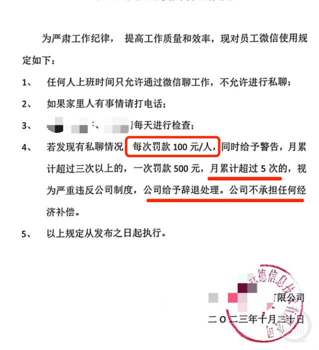 記者從截圖看到,截圖上有“為提高工作質(zhì)量和效率,員工在上班時間只允許通過微信聊工作,不允許私聊”“如果家里人有事就打電話”“每天進行檢查”“若發(fā)現(xiàn)私聊,每次罰款100元/人,月累計超過三次以上的,一次罰款500元,月累計超過5次的,給予辭退,公司不承擔任何經(jīng)濟補償”等等文字。