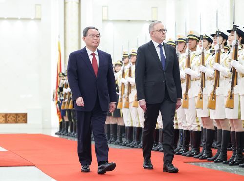11月7日上午,國(guó)務(wù)院總理李強(qiáng)在北京人民大會(huì)堂同來(lái)華進(jìn)行正式訪問(wèn)的澳大利亞總理阿爾巴尼斯舉行會(huì)談。這是會(huì)談前,李強(qiáng)在人民大會(huì)堂北大廳為阿爾巴尼斯舉行歡迎儀式。新華社記者 劉彬 攝