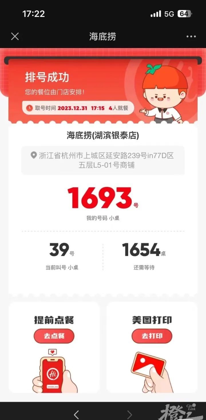 剛剛,橙柿互動記者查看了今晚杭州市區(qū)海底撈部分門店的預訂情況,17:22開始,海底撈湖濱店就顯示,等號1654桌。