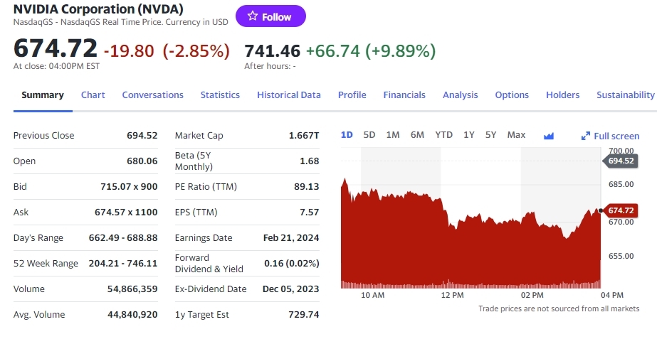 美國當(dāng)?shù)貢r(shí)間周三,英偉達(dá)股價(jià)在納斯達(dá)克常規(guī)交易中收盤下跌19.8美元,報(bào)收于每股674.72美元,跌幅為2.85%。在隨后的盤后交易中,英偉達(dá)股價(jià)上漲60多美元,截止本文發(fā)稿,該股交易價(jià)格為741.46美元,漲幅9.89%。