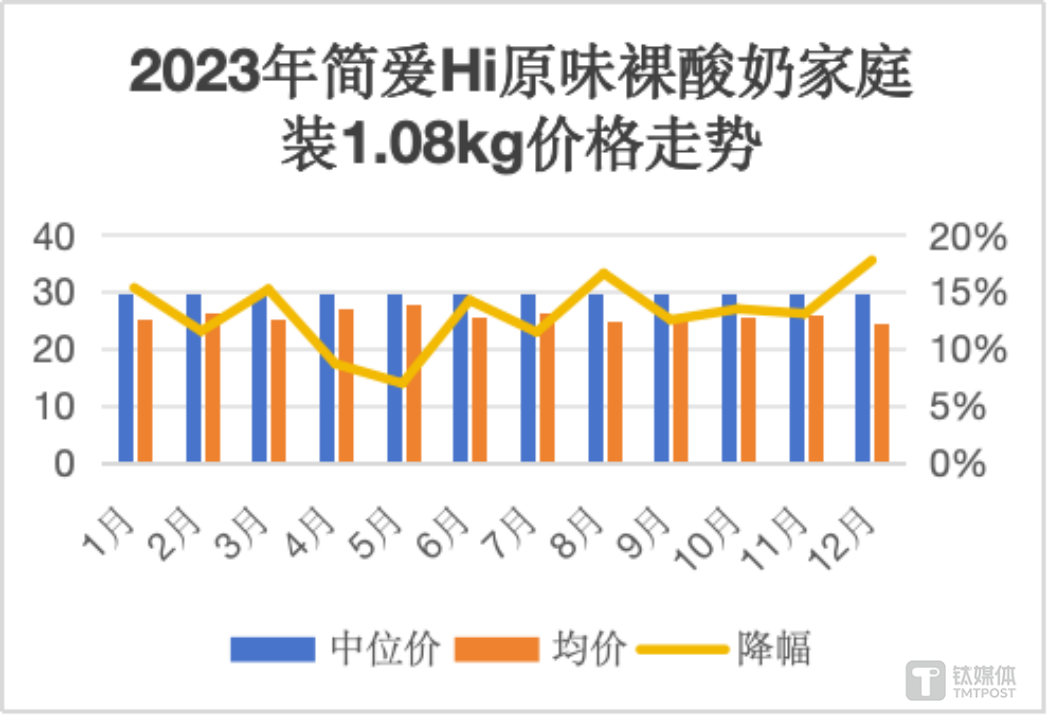 而簡愛酸奶的價格降幅也緊隨其后。馬上贏的統(tǒng)計數(shù)據(jù)顯示,1.08kg的簡愛Hi原味裸酸奶家庭裝的降價幅度最高,在2023年期間,其實際零售均價較標簽價的降幅維持在7%到18%之間。此外,450g的簡愛超級桶風味酸乳原味的降價幅度也一度從3%降至12%。
