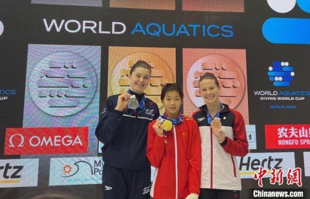 3月24日,在2024年跳水世界杯柏林站舉行的女子10米臺決賽中,中國選手全紅嬋(中)優(yōu)勢奪冠?!≈行律缬浾?馬秀秀 攝