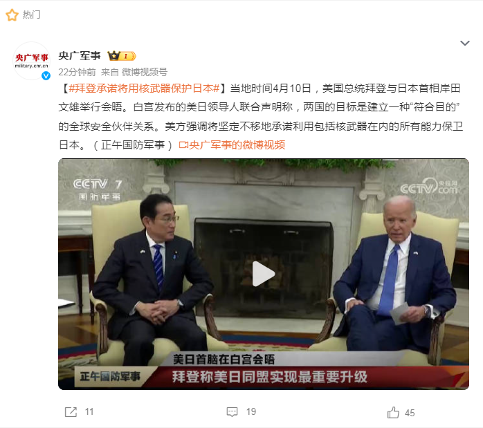 據(jù)央廣軍事微博,當(dāng)?shù)貢r間4月10日,美國總統(tǒng)拜登與日本首相岸田文雄舉行會晤。白宮發(fā)布的美日領(lǐng)導(dǎo)人聯(lián)合聲明稱,兩國的目標(biāo)是建立一種“符合目的”的全球安全伙伴關(guān)系。美方強調(diào)將堅定不移地承諾利用包括核武器在內(nèi)的所有能力保衛(wèi)日本。