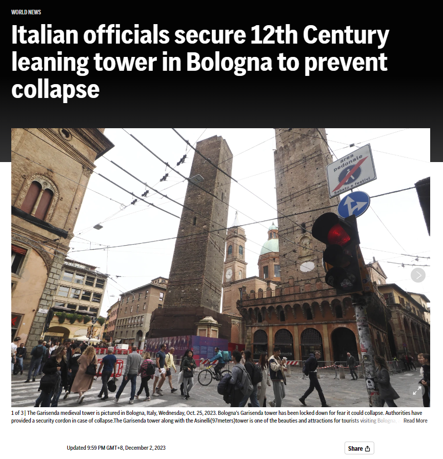 意大利近期確實有一座斜塔面臨倒塌風(fēng)險。該塔坐落于意大利北部城市博洛尼亞,當(dāng)?shù)卣媱澯门c加固比薩斜塔相同的裝置來加固此塔。