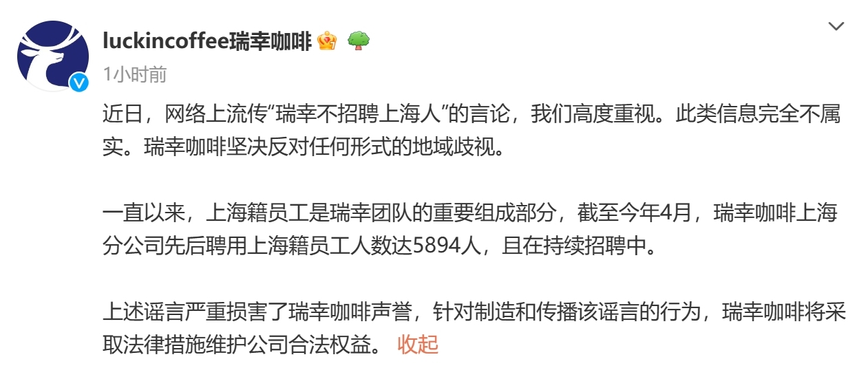 瑞幸辟謠“不招聘上海人”:堅決反對任何形式的地域歧視