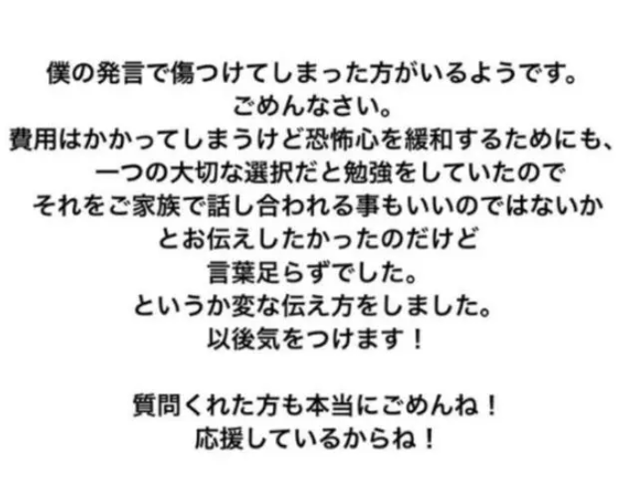 引發(fā)熱議和批評(píng)后,生田斗真發(fā)文道歉: “好像有人因?yàn)槲业陌l(fā)言受到了傷害。對(duì)不起。”他解釋稱自己的本意是希望對(duì)方能和家人一起討論和面對(duì),但自己沒能準(zhǔn)確表達(dá)出這個(gè)意思。