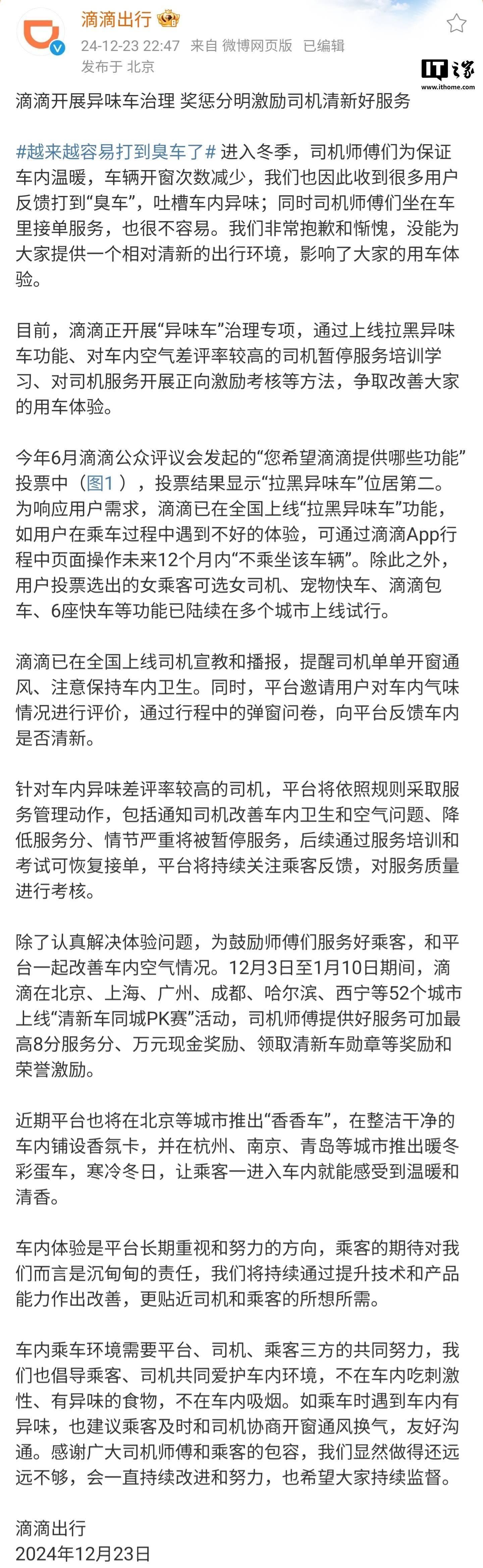 滴滴出行的這一系列舉措,不僅體現(xiàn)了對乘客需求的重視,也展示了其提升服務(wù)質(zhì)量的決心。通過多措并舉,滴滴正努力為乘客提供一個更加舒適、清新的乘車環(huán)境。