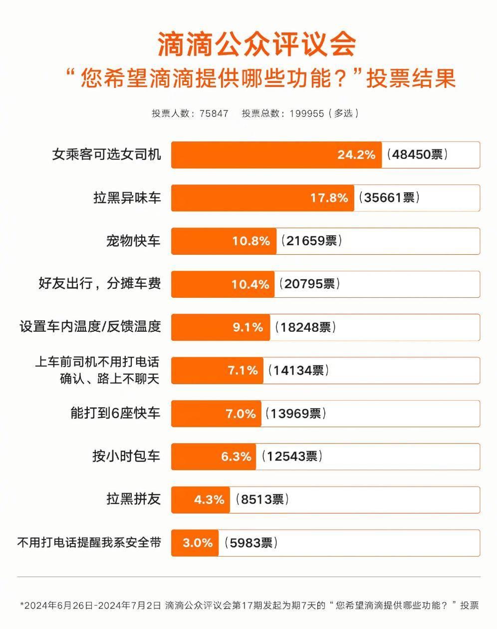 此前,在今年6月的滴滴公眾評議會上,“拉黑異味車”功能成為了用戶投票中的熱門選項,位居第二?;谶@一反饋,滴滴迅速響應(yīng),現(xiàn)已在全國范圍內(nèi)上線了“拉黑異味車”功能。乘客在乘車過程中若遭遇不佳體驗,可通過滴滴App在行程中頁面操作,在未來12個月內(nèi)避免再次乘坐該車輛。同時,其他由用戶投票選出的功能,如女乘客可選女司機、寵物快車、滴滴包車、6座快車等,也已在多個城市進行試行。